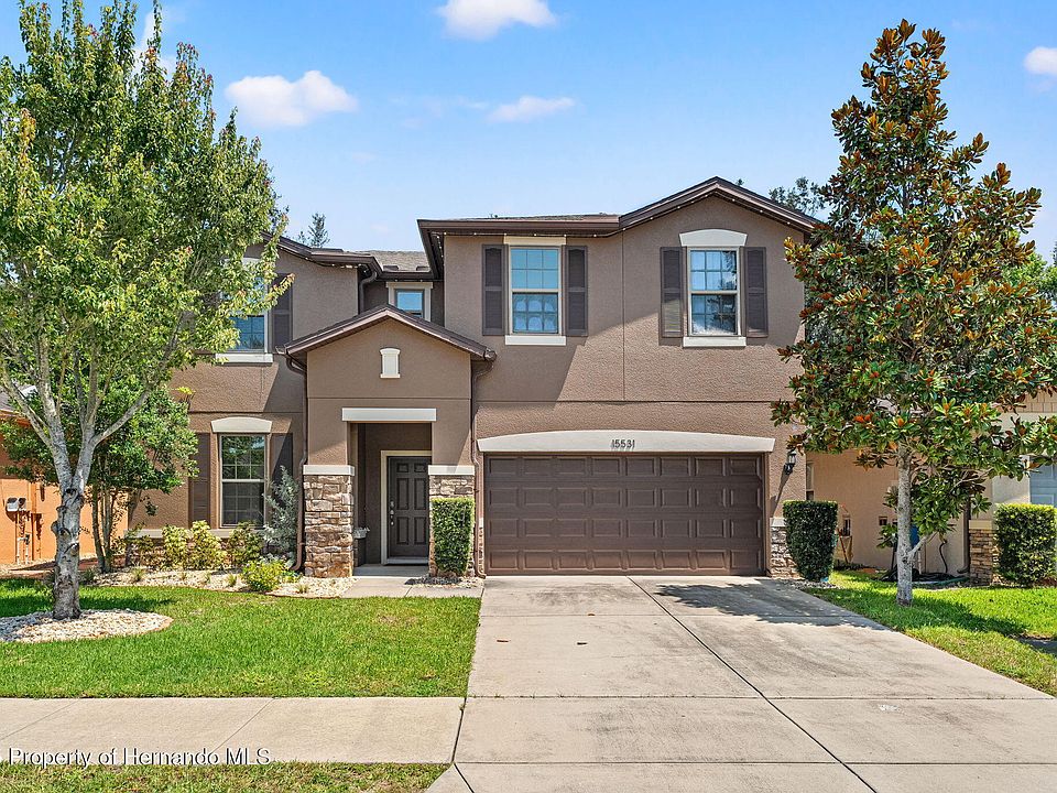 SELLERS ARE MOTIVATED!! This beautifully maintained SPACIOUS 4-bedroom, 2.5-bath home in the sought-after Trillium community, currently ZONED FOR NATURE COAST TECHNICAL HIGH SCHOOL offers 2,826 square ft of living space, features wide-plank laminate flooring throughout, a spacious kitchen with granite countertops with an oversized island, stainless steel appliances, plus a private main-level primary suite with walk-in closet and en-suite bath! A versatile first-floor multi-purpose room is perfect for a HOME OFFICE, playroom, or hobby space, while upstairs offers three bedrooms and a large FLEX AREA for a game room, media room, or second living space. The exterior was freshly painted in July 2025 and includes a fully fenced backyard with a covered rear porch. Trillium residents enjoy a resort-style pool and a prime location close to shopping, dining, the Suncoast Parkway, and US 41 for easy commuting. NO CDD's! Schedule your private tour today and see why this one is a must-see! **CLOSE FAST BEFORE THE HOLIDAYS!