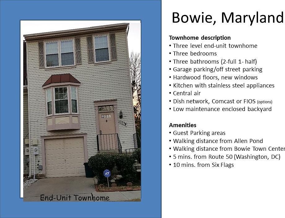 End-unit three-level town home with one-car garage. Hardwood flooring on the main level. Main bedroom has a private bathroom. Cathedral ceilings in main bedroom. Basement cannot be used at a bedroom. one year