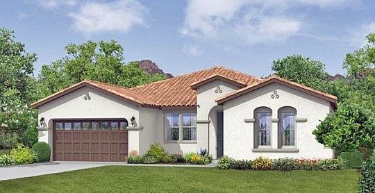 Plan 6 Acacia 2814 sq. ft., single story, Spanish exterior design on corner home site with plenty of room for RV parking. 3-car tandem garage, 4 bedrooms, 2.5 baths, mud room, large laundry room with sink, great room with fireplace, study, white cabinet, granite counter tops, stainless steel appliances.