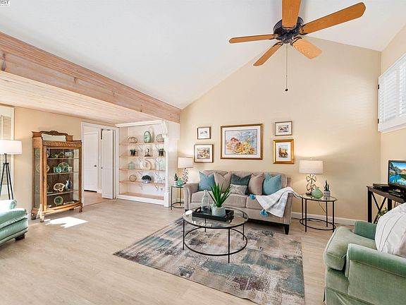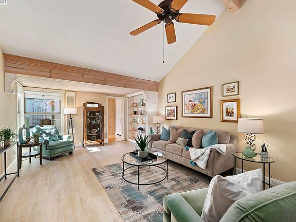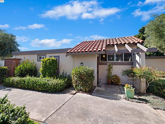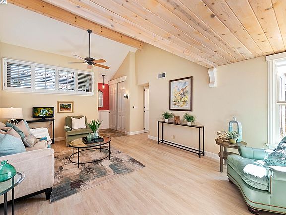 Step into this detached single-story villa, where cottage-inspired touches welcome you at every turn. The dining area boasts whitewash wood-paneled ceilings, complemented by built-in bookshelves and shutters. The updated kitchen is complete with bamboo floors, a farmhouse sink, maple shaker-style cabinets, quartz and butcher block countertops, and tumbled marble hood. High ceilings in the living area allow natural light to flood in through the double-hung dual-pane windows. The master suite is a tranquil retreat, featuring a cedar-paneled walk-in closet and a ceiling fan. Meanwhile, the 2nd bedroom offers convenient access to the hall bath with a tub. Outside the gorgeous gardens and a slate patio, shaded by a pergola and is an idyllic spot for leisurely afternoons tending the garden with rosemary, chives, and spring blooming jasmine. Privately situated with a zero-lot line, the home and garage share no walls with any neighbors. This welcoming community further enriches your lifestyle with amenities such as a refreshing community pool, a community center for gatherings, and a grassy play area. Gated RV parking available. When you're ready to explore, Pleasanton's historic downtown is less than a mile away. Iron Horse trail is just down the way.
