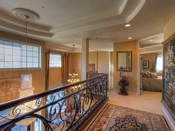 Fabulous Redlands home! Custom built by Jim Gross with wonderful upgrades, including marble and travertine floors. Stunning kitchen enhanced with granite counter tops, Alder custom cabinets, Center Island with veggie sink; breakfast nook; large pantry and double ovens. Bedroom downstairs with private bath. Custom Chandeliers at entry and formal living room that have mechanical elevators to bring down the chandeliers for cleaning. Family room with stone fireplace, built-in Alder entertainment unit, and surround sound. ~800 square feet added to include game room equipped with pool table, and library/office, both with French doors leading to back yard. Gorgeous iron work with huge foyer leads to formal living room and private dining room. Second floor has two bedrooms that share shower tub area and have their own vanity area. Master suite enjoys fireplace, large bath, walk-in closet, and large balcony. Entertainers delight with long winding driveway to elegant front with beautiful iron work and fountain. Lush landscaping professionally done. Basketball or game court and three car garage.4 bedrooms, 3.5 baths, 4,270 square feet