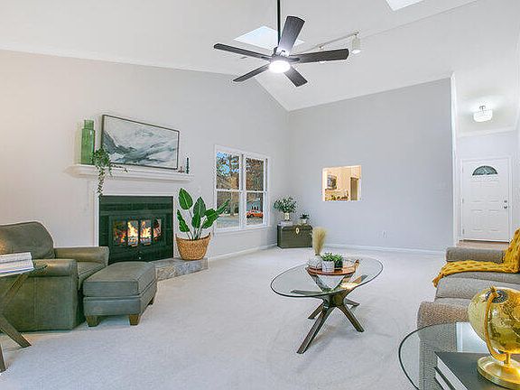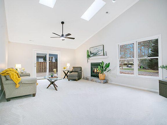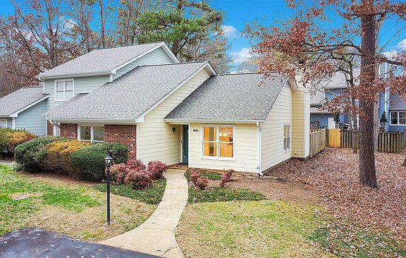 Amazing location with one story living in this well-maintained townhome freshly painted for you! Large updated eat-in kitchen with sunlight streaming in. Living room/dining room with vaulted ceilings, newly replaced skylights, and fireplace that feels spacious, comfortable, and bright. This area leads to the fenced backyard with expanded decking, storage room and grass area that is mowed by the HOA! Primary bedroom with ensuite bathroom with a walk-in shower and 2 closets. Generously sized secondary bedroom with two closets and an additional full bathroom complete this home. Just about a block away is a beautiful pool, playground, and tennis courts for leisure AND activity! Come enjoy this low maintenance townhome and all this amazing North Raleigh location has to offer!