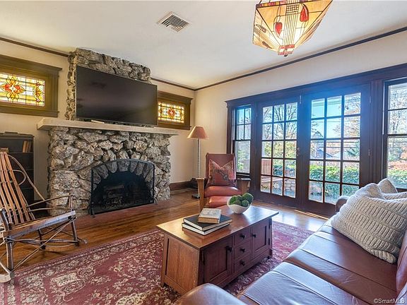 Fabulous 1920's gem on Main Street! Beautiful bungalow with classic & sought after bungalow features. Home of this era and style are a rare find in Glastonbury! Stunning stone fireplace in the main family room, which opens to a large stone porch which spans the front of the home. First floor home office with built-in bookshelves, large dining room with antique built-in breakfront. And an incredible two story sunroom, with windows on all sides, stone floor & walls, and interior balcony. Two bedrooms on the first floor, both with hardwood floors, and a recently remodeled full bathroom. The second level hosts the master bedroom, bath and sitting room/office. The back family room overlooks a very large wood deck, and beautifully landscaped yard. A spacious rebuilt three car garage with plenty of additional storage on the second level is off the rear of the home. Walk to the center of town, or South Glastonbury. Centrally located, always admired, and a home that won't last! Please follow Covid 19 showing protocol. All people entering the home should be wearing masks.