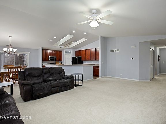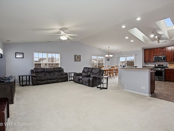 Spacious and BEAUTIFUL describe this OPEN CONCEPT town house freshly painted in today's most desired color. Step into the living space with volume ceilings in this great room, kitchen with TONS OF COUNTER SPACE & cabinets galore, breakfast bar, large pantry and all appliances including new stove, dining room opens to deck making this an ideal entertaining space. Huge master suite offering bath with soaking tub and separate shower, large walk in closet and ceiling fan. Bedroom 2 with generous closet space & ceiling fan. Convenient MAIN FLOOR LAUNDRY, washer/dryer stay, and 2 car garage complete this beauty with a location that makes commuting a breeze! Just minutes from I90, METRA, PACE BUS and tons of shopping and restaurant options within walking distance, so close you don't even need a car! Nothing to do to this gorgeous home except move in and make it yours today