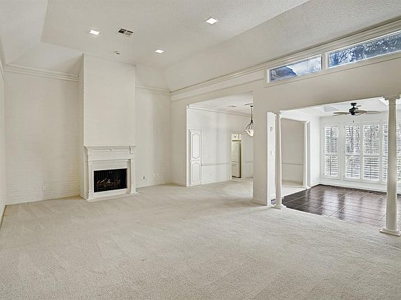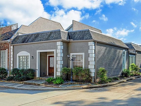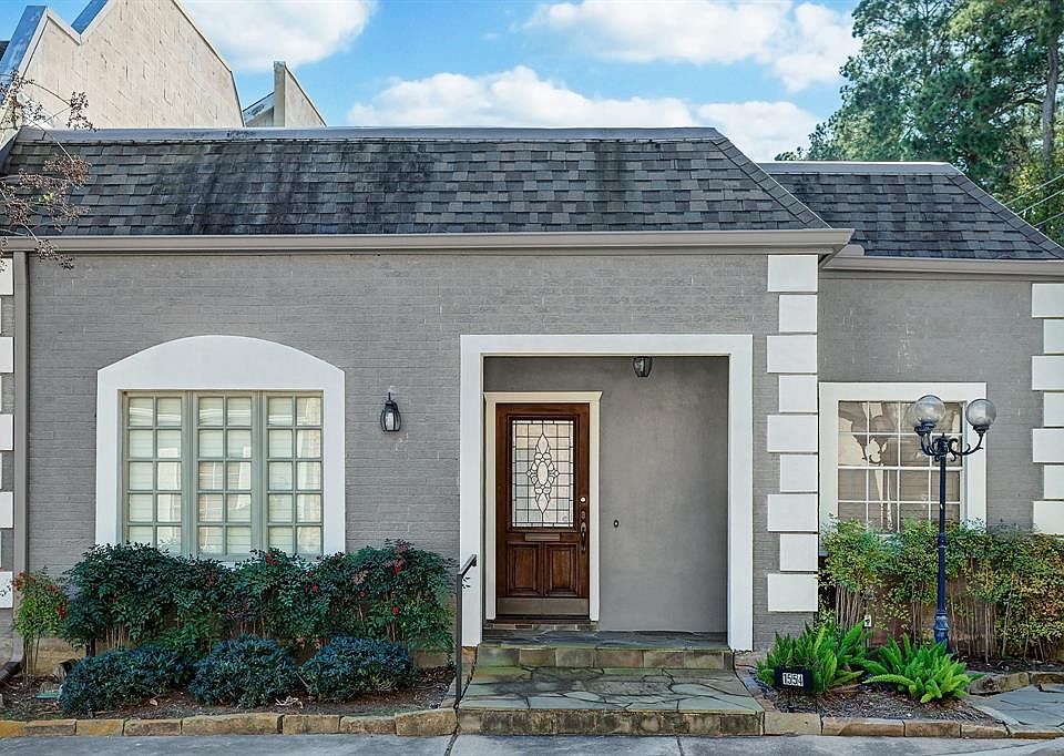 Rare 1 story stunning traditional townhome with excellent curb appeal and over 2,000 sq. ft. in the coveted Woodlake Forest Townhome Community. Home features spacious primary suite on first floor with walk-in closet, large primary bath with jetted tub. Spacious family room with soaring ceilings and gas log fireplace, opens to sunroom and dining room with storage cabinet. High soaring ceilings, beautiful luxurious crown molding and trim, plantation shutters, and ceiling fans throughout. 3 art niches. Home office/study in front area of home could be a 3rd bedroom. Second bedroom has en-suite bathroom with oversized shower and walk-in closet. Interior paint December 2021, Roof June 2016, comfort height toilets. Oversized garage with custom built-in storage cabinets. Located on corner with lots of light & extra windows!! Close to Beltway 8, City Centre & Memorial City Shopping and Restaurants. Two community swimming pools. Low HOA fees. NEVER FLOODED per seller.Thank you for your interest!