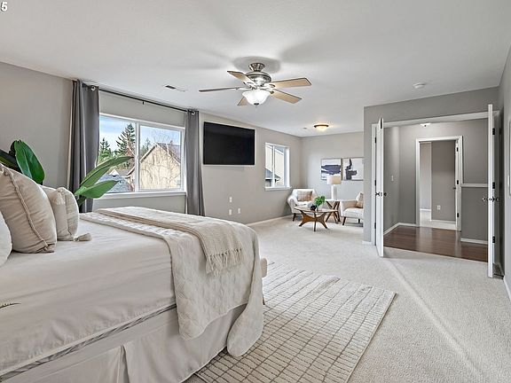 Nestled in Eagles View on Bull Mountain, this spacious 5-bedroom, 2.5-bath home is truly move-in ready. Updates include new exterior & interior paint, new roof, new carpet, automatic blinds, beautiful kitchen remodel and fresh fixtures throughout. The two-story entry welcomes you with pristine chestnut hardwood flooring. With large windows, the living room feels bright and open, anchored by a gas fireplace with marble surround. The kitchen features quartz countertops, tile backsplash, smoky black stainless steel appliances, 5-burner gas range and a walk-in pantry. The adjacent nook opens to the deck with a view. A main level office, off of the entry, with built-ins and walk-in closet could be used as a 5th bedroom. And there’s a swanky laundry room with built-ins and barn-door pass-through between the kitchen and garage. Upstairs, you’ll find the spacious primary suite with a cozy sitting area, dual sinks, soaking tub, walk-in shower, and a walk-in closet. Three additional bedrooms plus a large open bonus room offer flexible lifestyle space upstairs. Central air, refurbished gas furnace, 2024 gas water heater, Hardie Plank siding, and new composition roof & gutters in 2025. Located on a corner view lot just one block from the active neighborhood park in a sought-after school district.