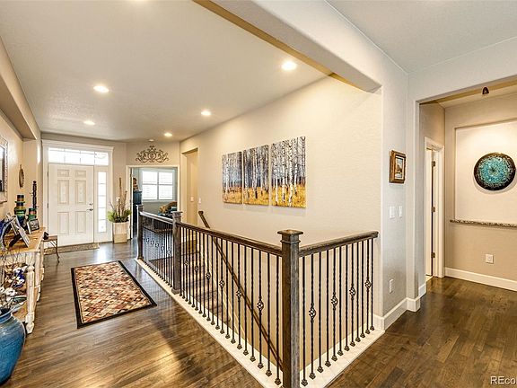 Breathtaking home located in the Villages at Buffalo Run this popular 3 bedroom, 2 bath, ranch-style floor plan combines contemporary designs with modern functionality. Built in 2015 this well cared for home, features many exquisite finishes throughout including: Luxurious hickory hardwood flooring throughout the main living areas, newer designer carpet in the bedrooms and stylish Hunter Douglas plantation shutters and Roman vertical sillouette widow treatments. The chef's dream kitchen features an elegant array of stainless steel appliances, granite counter tops on java stained cabinets opening to a family room with south facing windows inviting in lots of natural light. The spacious Primary suite features trey ceilings with built-in speakers, a well appointed 5-piece bath and spacious walk-in closet. Just down the hall is the well equipped main floor laundry room - complete with with stylish cabinetry for storage of laundry essentials and a handy utility sink. The two secondary bedrooms are spacious and flexible enough to accomodate most furniture arrangements. Down stairs you'll find a spacious open basement configuration that's ready for your finishing touches. For the collector of wines or the budding enthusiast in your household, the climate controlled 12x8 wine cellar complete with custom wine racks is essential. The outdoor living space offers a serene, park like setting. Extended stamped concrete patio, Hot- Tub/Pergola and outdoor sound - the perfect retreat for entertaining or enjoying a peaceful evening at home. Quiet golf course community with nearby parks, shopping and easy access to I-76, E470 and DIA.