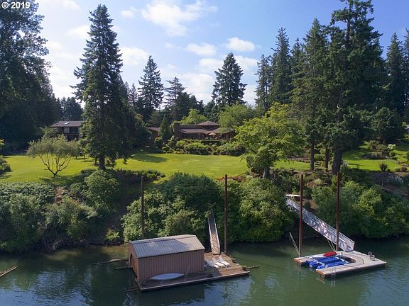 Contemporary Frank Lloyd Wright inspired home nestled on over an acre of manicured riverfront grounds. High ceilings and large windows accompany architectural elegance with beautiful views and deck access from nearly every room. Amenities abound with dock, boat house and combined 6-car garage. Gated and light-filled, this river oasis provides a private haven, while only a short drive from I-5.
