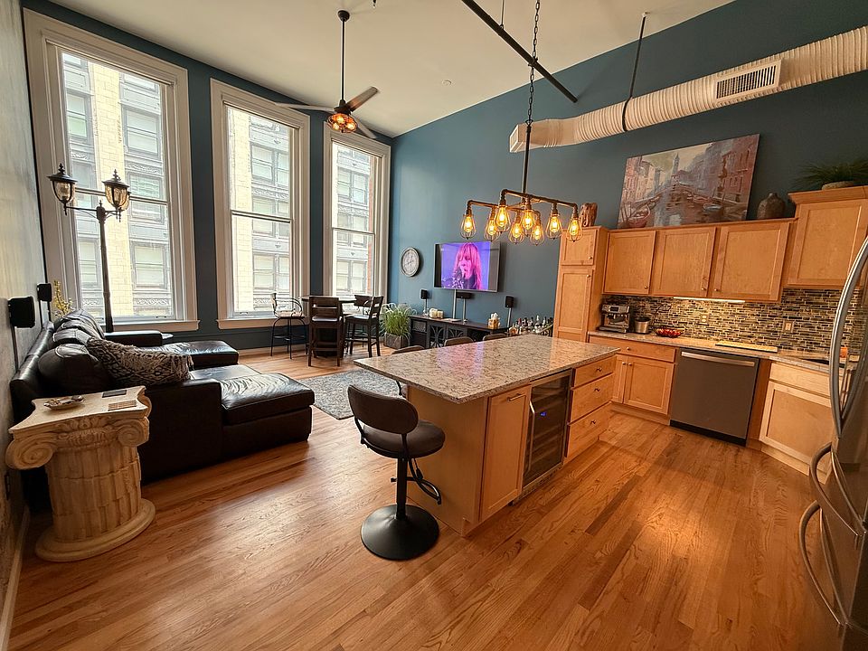 Enjoy this spacious, recently renovated 2-bedroom, 1-bath fully furnished loft with vaulted ceilings, hardwood floors, and oversized windows showcasing stunning views of the 16th Street pedestrian walkway.