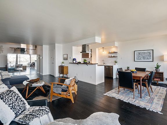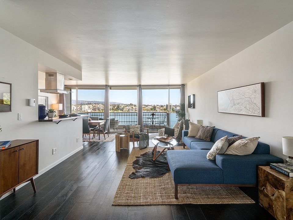 Dramatic views are everywhere is this spectacular Lakeside residence in Downtown Oakland. Designed by Micheal Marx, a Frank Lloyd Wright protege, of concrete & steel in 1963, this spacious two bedroom - two bath split level unit features seamless indoor - outdoor connection and a nice separation of public and private spaces. From the moment you step inside, the floor to ceiling windows reveal a stunning view of Lake Merritt. The great room and updated open kitchen spill out to a large private balcony. Both bedrooms also open out to a generous sized private balcony with incredible views of the ever changing,historic Downtown Oakland skyline. Gorgeous open kitchen with a walnut breakfast bar is the perfect place to enjoy a meal. Beautiful wood flooring throughout. Primary suite has a deep soaking tub. Lounge inside or out from sun up to sun down, whether you are in the mood to see city life or you prefer to chill "Lakeside", this residence will not disappoint. Never worry about porch pirates, the 24 hr door person ensures that you always get the packages! Located across the street from Lake Chalet & blocks to the Museum & Lake Merritt BART. Pets welcome! owner pays water, renter pays electric, small pets allowed and absolutely no smoking