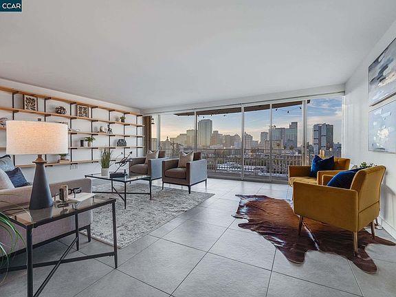 Experience one of Oakland’s premier addresses at the Lakeside Regency, built of steel & concrete in 1968 & designed by Michael Marx, AIA—an apprentice of Frank Lloyd Wright. This mid-century modern gem spans over 1,300 square feet on a single-level 16th-floor plan, offering an ideal separation of private & public areas plus the rarity of in-unit laundry. A floor-to-ceiling wall of windows draws you to the expansive front balcony—an entertainer’s dream with panoramic Oakland skyline views. The spacious living room features tile floors & newly installed full-wall shelving, while the remodeled kitchen (also boasting breathtaking views) is outfitted with high-end appliances & a generous dining area. Both bedrooms, including an ensuite, serve as serene retreats from city life, & both bathrooms have been beautifully updated from top to bottom. Other upgrades include Hunter Douglas motorized blinds, pendant lighting, & carpet tile. Building amenities offer the best in urban living: 24-hour door service, a shared mezzanine, a roof deck, & a clubhouse. Your unit comes with one deeded parking space & an additional storage closet. Pets welcome. And with Lake Chalet Restaurant, Oakland Museum, Lake Merritt BART, & more just steps away, you’ll have everything you need right at your doorstep!