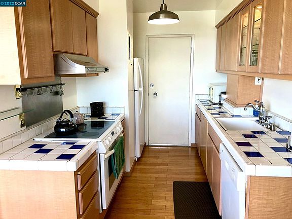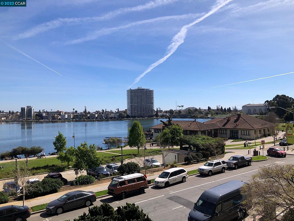 'Double view' unit in Lakeside Regency offers the best of urban living. Secured elevator transports you to 3rd floor condominium with incredible Lake Merritt views with generous patio/decking enveloping living room, dining area and galley kitchen. Two light washed bedrooms, including primary, boast city views and equally spacious balcony. Smart bathrooms feature stone flooring, stall shower and shower over tub, stone counter tops