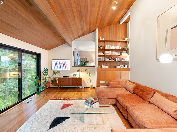 NW Regional modern masterpiece designed by renowned local architects Saul Zaik and Jim Miller, built in 1973. This unique home was meticulously designed to contour the landscape and seamlessly integrate with the surrounding nature. Enter the sunken living room, where a breathtaking wall of windows overlooks a lush forested lot, creating the illusion of floating in the trees. This inviting space features a stunning vaulted wood ceiling, a natural wood feature wall surrounding a travertine fireplace with a built-in floating bench plus original built-in bookcases & cabinets. The spacious kitchen has original wood cabinets and built-ins with plenty of counter space. The adjacent dining room and kitchen are illuminated by glass walls that flood these spaces with natural light while offering views into a private fenced courtyard with a deck, perfect for outdoor dining. The main floor offers a large bedroom, an office with a forested view, along with a full bathroom.The entire upper floor is dedicated to the primary suite, featuring a vaulted wood ceiling and forested views that give it a lofted airy feel, a large walk-in closet, and an en-suite bathroom. The lower level daylight basement includes two additional bedrooms, full bathroom,large laundry room, and a great room with floor-to-ceiling windows providing connection to the outdoors. A double-car garage is conveniently connected to the home on the main level. The exterior is beautifully landscaped with a vegetable and flower garden, a patio for lounging & fire pit gatherings plus a forested backyard on a private double lot with trails throughout, offering many opportunities to explore and enjoy nature. This stunning space is tucked into a culdesac at the top of Gresham Butte with peek a boo views of Mt Hood from front deck and just minutes to Main street with local restaurants+shops, farmers market, Trader Joe's (opening fall 2025), the Gorge, Edgefield and Portland.