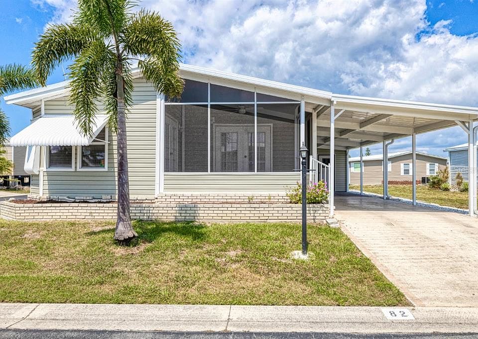 Discover your dream retreat in this gated, Resident-Owned Community, 2-bedroom, 2-bathroom, turnkey gem that is boasting 1,326 sqft of open living space and includes Park Real Estate Share valued at $32k. As you step inside, you will find beautiful wood flooring throughout, with waterproof wood-look laminate that enhances the newly remodeled 2021 kitchen. This bright kitchen also features beveled formica counters, lots of drawers & a brand-new dishwasher & microwave. The inviting living space is complemented by new french doors, new bath & shower fixtures and an inside laundry room with plenty of storage. You will also enjoy free wi-fi with the park antenna that has been installed on the home, saving you the installation fee of $279! In 2021 the York A/C unit was installed by Kobie Electric and has a transferable 10-year warranty. Nestled on a prime corner lot in a vibrant 55+ golf cart community, this home is a true standout with its new 2023 roof & gutters, stylish new lanai with in noseeum screens and sturdy-up to code new 2024 carport. Enjoy peace of mind with double-pane tilting windows, making cleaning a breeze and 11 new tie downs. This home also features charming clamshell shutters, and in 2023 the siding was replaced and reinforced with OBX-TYVEK board, and the old gray plumbing was completely replaced-up to code- with an easy access tree box in 2021. This home has abundant storage, including an outside shed which houses the hot water tank and ample space for all your belongings. This active community offers an array of amenities, including a heated pool and spa, pickleball & tennis courts, shuffleboard, a library, a complete exercise room, a dog park, a clubhouse and fabulous banquet hall. Enjoy convenient access to shopping, dining, and the Punta Gorda Airport, just 10 miles away. Embrace the lifestyle you've been waiting for in this meticulously maintained haven.