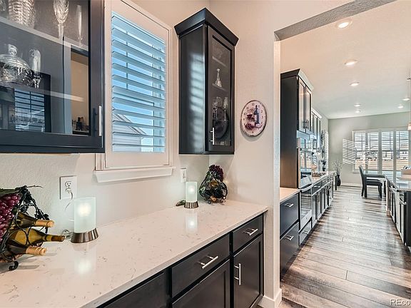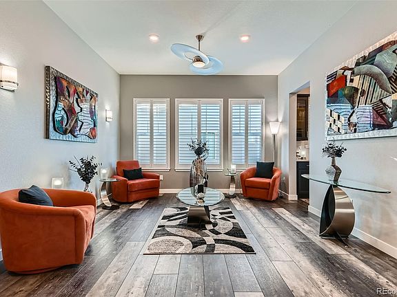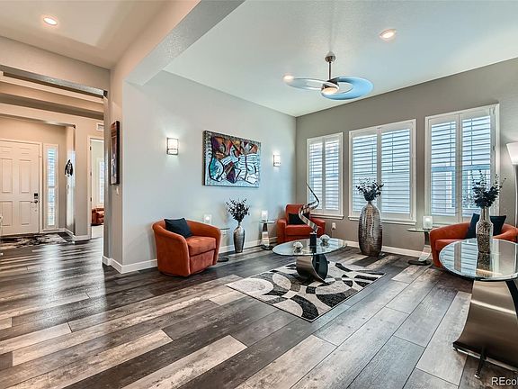 Welcome to 15551 Xanthia Court, a truly remarkable property located in the prestigious gated community of Heritage Todd Creek. Designed for active adult living, this home is perfectly situated in a premium cul-de-sac location, backing to the fairway and offering breathtaking mountain views. Every detail has been meticulously curated, with over $135,000 in post-purchase upgrades that enhance both the beauty and functionality of this exceptional residence. The gourmet kitchen is a chef’s dream, featuring 42-inch-tall cabinets with crown molding, soft-close doors, and slide-out shelves for convenience. Under-cabinet lighting highlights the quartz countertops and elegant tile backsplash, while the large island provides ample space for meal preparation and entertaining. This kitchen is equipped with double ovens, a five-burner gas cooktop, and a butler’s pantry, offering both style and functionality for the home chef. The primary bedroom is a serene private retreat, offering stunning golf course and mountain views. The luxurious primary bath boasts a walk-in shower, dual vanities, and a spacious walk-in closet with a custom organization system to maximize storage and convenience. In addition, the professionally finished basement provides additional space for entertaining or unwinding, complete with a sauna that is included with the property. As if this was not enough, the outdoor living space is a true highlight, featuring $80,000 in professional landscaping, a custom paver patio, a retractable awning, and a gas-plumbed firepit and BBQ, making it perfect for entertaining or quiet relaxation. This home is part of a vibrant, active adult community offering luxurious amenities, including a clubhouse with a fitness center, a pool, tennis courts, and a variety of social and recreational opportunities. This property perfectly blends serene golf course living, luxurious community amenities, and a beautifully upgraded home, making it a rare opportunity.