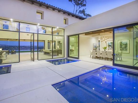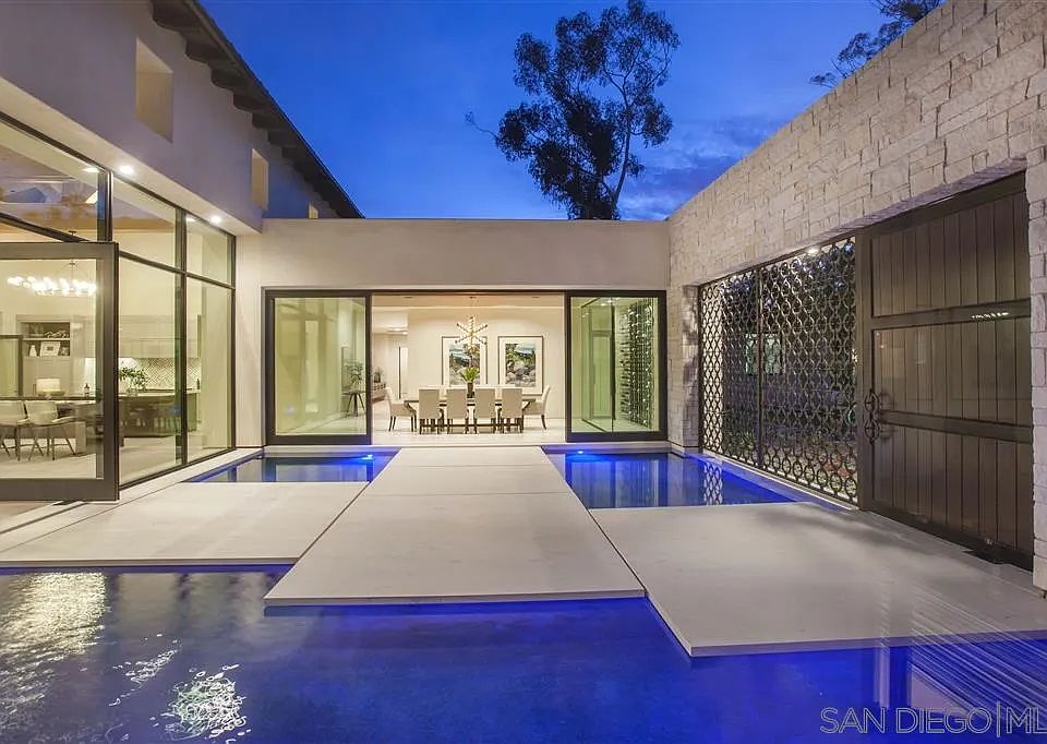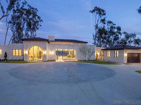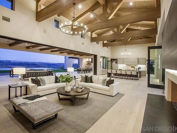 Timeless Contemporary Estate in the West Covenant of Rancho Santa Fe. New Construction, exceptional elevated, unobstructed views. Alluring Custom Estate abounds with Luxury at its finest. Exquisite all One-Level living floor plan offers Grand scaled, high beamed great room with 40’ wall of glass that disappears into pocket for seamless indoor/outdoor living. Gourmet Dream kitchen with twin waterfall-style honed marble islands & butler’s pantry.