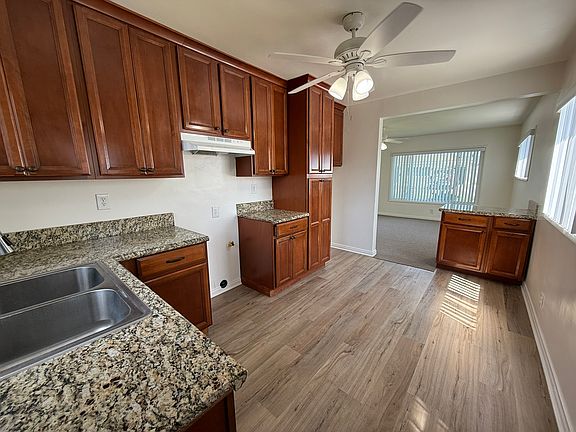 Discover the charm of this beautifully updated 900 square foot home in the heart of Bellflower, CA. Built in 1970, this residence features two inviting bedrooms and a modern bathroom, making it the perfect retreat. Step inside to find a stunning kitchen adorned with walnut cabinets and sleek granite countertops, complemented by durable vinyl flooring. The upgraded bathroom and new ceiling fans throughout enhance the overall comfort and aesthetic of the home, while sliding mirrored wardrobe doors add a touch of elegance to both bedrooms.