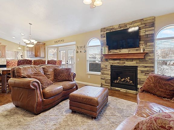A delightful home with wonderful curb appeal and attractive interior upgrades. The kitchen and great room have hardwood flooring with stainless steel appliances and custom cabinets. A huge contrasted kitchen island spans the space with added storage underneath. See the recently added fireplace which adds character and warmth to the living area. This west facing home means a spacious shaded backyard for grilling and endless outdoor fun! Extra storage above the garage! RV Pad! UTOPIA Fiber!
