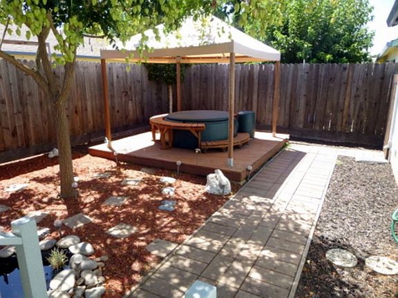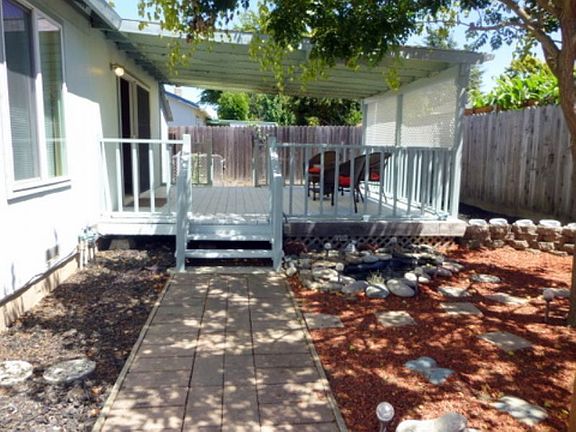 This 3BR/2BA home has a kitchen/great room with a dining and family room. There is a butcher block island with a casual dining bar/long counter, and a pantry with floor to ceiling shelving. Included in the living room is a fireplace and access to the enclosed backyard. There is a ceiling light/fan in every room and a master bedroom with plantation shutters and a walk-in closet. The hall bath has been updated. There is a huge enclosed storage room next to one side of the 2 car garage and there are front and back gates there that open for added convenience. A washer and dryer and a hair styling station with hydraulic chair, cabinets, and a workbench, are all included in the garage. The backyard offers a hot tub with seating and a cabana overhead, a large covered deck, and a row of raised gardening beds. Pet submit! To view this special home, please call Matt at 415 847-9249. Thank you!