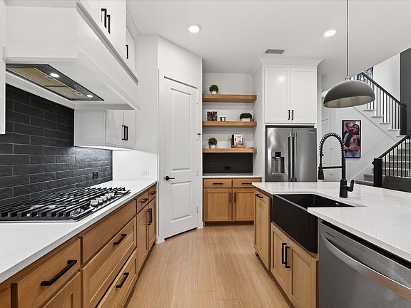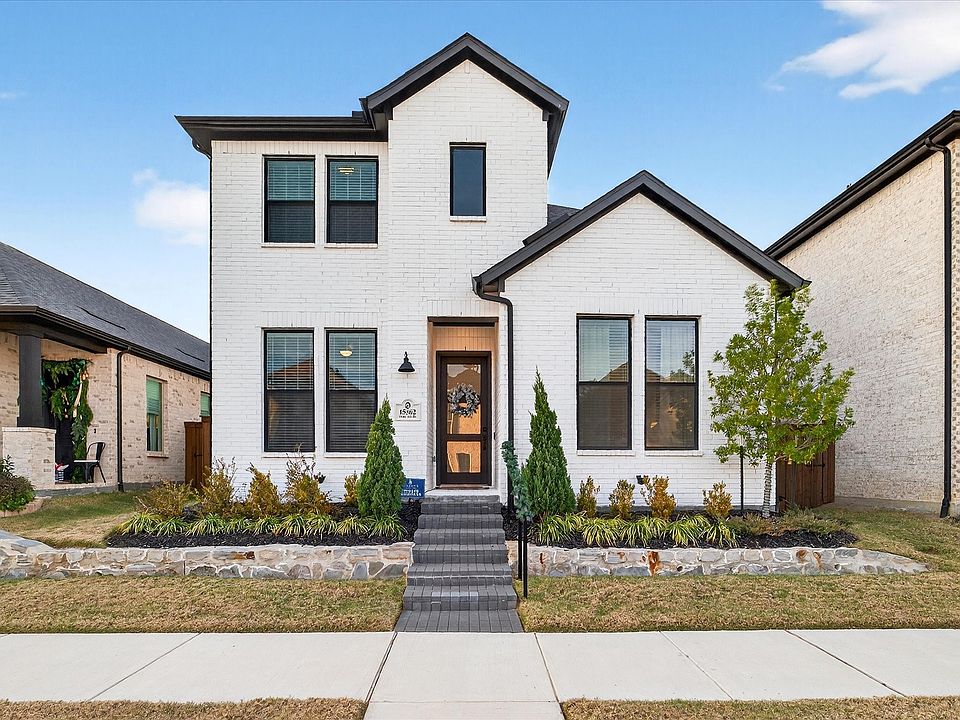 Welcome to 15562 Fringe Tree Rd — a standout home in The Grove, one of Frisco’s most sought-after neighborhoods. The curb appeal hits immediately: crisp white brick, bold black accents, and a clean, elevated presence that sets the tone for what’s inside. Step in and the home opens up with serious presence. Light wood floors, soaring ceilings, and an open-concept design create a bright, airy vibe that feels both stylish and incredibly livable. The two-story living room brings the drama with its deep charcoal accent wall, stacked windows, and sleek fireplace—perfect for hosting, relaxing, and everything in between. This four-bedroom, three-bath layout is dialed in for today’s lifestyle, featuring two bedrooms on the first floor—ideal for guests, multigenerational living, or a dedicated office space. The kitchen is a true showpiece. The contrast of white cabinetry and warm wood tones, an oversized island, quartz counters, matte-black fixtures, and those statement pendants create a look that feels fresh, clean, and effortlessly cool. The seamless flow from kitchen to dining to living makes entertaining a breeze. Every corner of this home feels intentional—nothing overdone, nothing missing—just a space that welcomes you in and makes an impression without trying too hard. And living in The Grove takes it even further: tree-lined streets, resort-style pools, parks, trails, a community coffee shop, and award-winning Frisco ISD schools. It’s a lifestyle people move to Frisco for. Bright. Stylish. Elevated. This home checks every box—and then some.