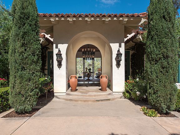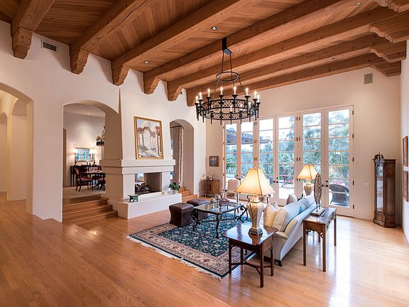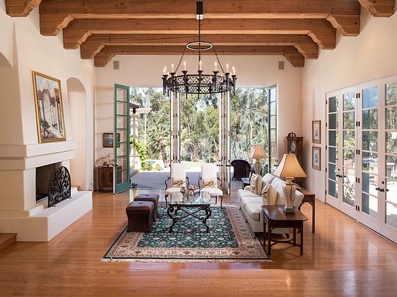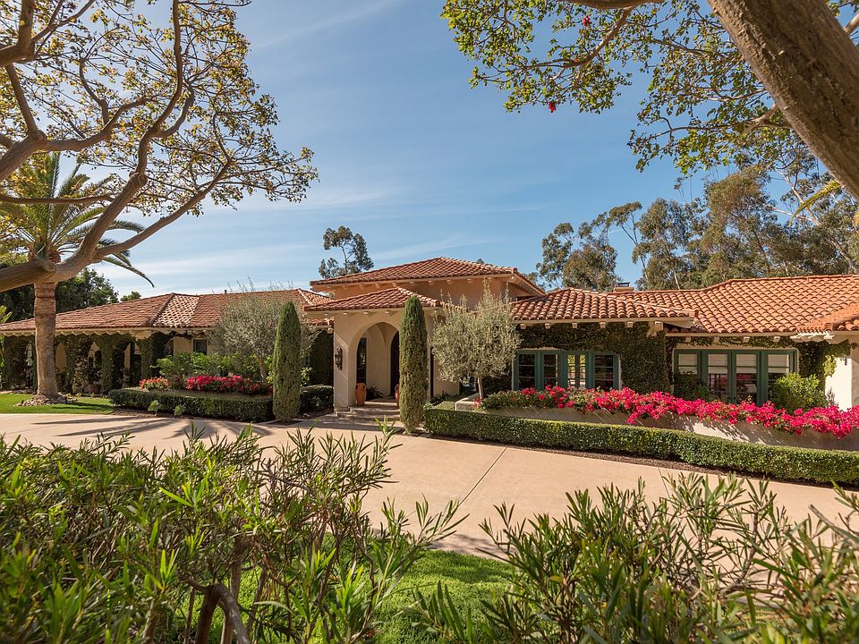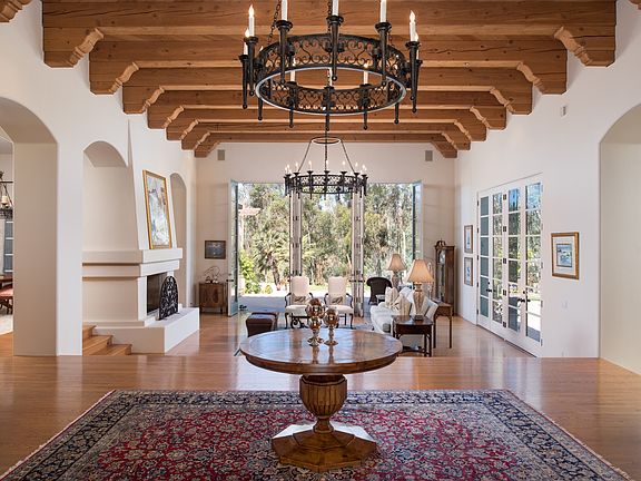 Located on a quiet tree-lined street on the west side of the Covenant, this airy one story Mediterranean enjoys natural light, high ceilings, soaring French doors, and private canyon views. The 6 bedroom floor plan flows comfortably and includes 2 separate wings, a designated office, den or game room, and 4 car garage. Spacious rooms combine with cozy living spaces to accommodate a variety of family types and lifestyles. A welcoming foyer leads to the formal living room with fireplace and direct access to the outdoors and a butler's pantry connects dining room to gourmet kitchen and breakfast nook, all opening to the generous-sized family room. Sumptuous in design and function, the master retreat has designer bath with soaking tub and walk-in closets. Rich with warm details, this 8,000+ sq. ft. residence exudes a refined yet understated ambiance blending quality materials with timeless accents such as elegant arched doorways, hardwood floors, beamed ceilings, and stylish lighting. Thoughtfully set on 2.49 acres above a wooded ravine, the property is graced with sweeping scenic views, ocean breezes, and a sense of intimacy and seclusion. An expansive entertaining patio overlooking the pool and spa and multiple outdoor lounge areas offer several options for relaxation and enjoyment of the easily maintained grounds. Visitors will appreciate the one bedroom/one bath detached guest casita with fireplace and kitchenette. This parcel includes a newly graded, flat pad ready for horses, tennis court, or other amenity.