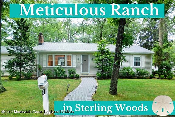Beautiful ranch nestled in sought after Sterling Woods sec. of Wall Twp. This lovely home boasts one floor living (Ranch style) with updated kitchen, 3 BRs, 1.5 baths and deck from dining room overlooking quiet setting on 118 x 92 corner lot. Hardwood floors under carpeting throughout! Full finished basement w/separate room for guest area/office + separate storage/utility area & workbench. Attached 2 car garage, Belgian block paver driveway & walkway. Opportunity to join the exclusive Sterling Woods Assoc'n ($60/yr) for private dock/river access & boat slips. This assoc'n hosts many fun events for you & family to enjoy the Manasquan River waters. Pristine beaches, Manasquan River golf club, restaurants & shops: all minutes away. Great value in Sterling Woods. Room for a pool!