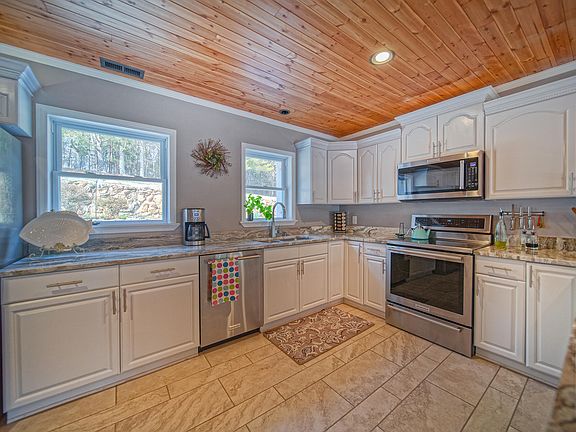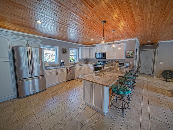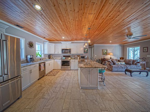 If you are looking for the WOW factor , this is it! The lake home has been totally updated. The double glass door entry is just the beginning. As you catch your breath you enter a two story great room with a floor to ceiling stone, wood fireplace and open wood beams. The updated gourmet kitchen has new marble counters, new upscale appliances, tile and wood ceilings. The adjoining family room overlooks the lake and also has a fireplace perfect for entertaining and family gatherings. The screened porch is a perfect place to relax and enjoy the wildlife. A new paver patio and walkway with a fire pit has been added and leads down to the new Trex dock.