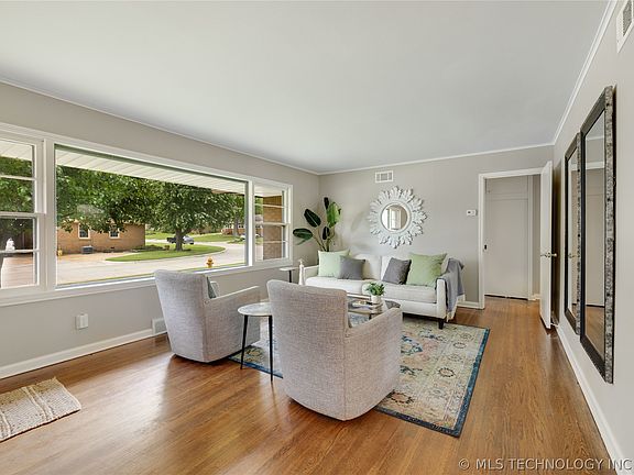 Great location in Brookside just over a mile to Gathering Place & convenient to all shopping & restaurants! Hardwood floors in great condition. Kitchen w/ new fixtures at double sink & all appliances, spacious dining area + pass thru to 13.5'x26' den w/ fireplace. Built-in drawers in 2 bedrooms & hallway. Baths w/ pedestal sinks. Living room is 12'x17' w/ lots of natural light. Home just repainted inside & out. 2014 Trane HVAC. Big backyard w/ double sized front gate. 5'x9.5' storage closet in carport.
