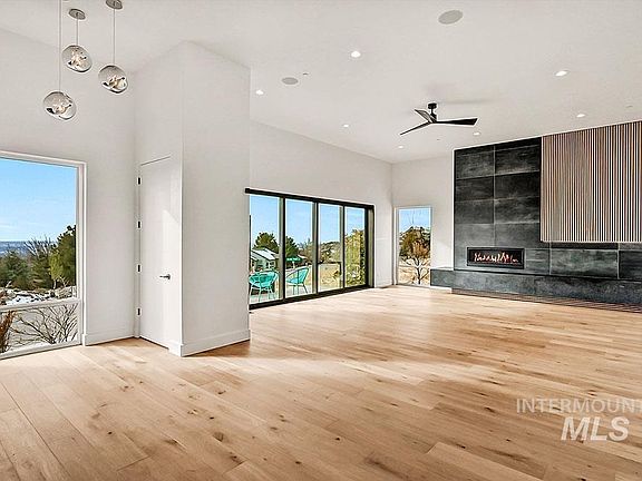 A magnificent Contemporary view home atop Boulder Point. This exquisite custom new build by Borgata Building Company was thoughtfully integrated into the setting while presenting a flawless and streamlined home for modern living. Walls of glass and elevated ceilings highlight the views... a vast canvas of ever-changing colors and sky patterns over the valley. The interior is visual artistry with a balance of bold accents and refined lines, with hand-selected details throughout. The inspired great room design makes a striking first impression, as a large format tile fireplace wall anchors the weightlessness created through a marvelous telescopic sliding door set to the front view terrace complete with gas fire table. Spaces effortlessly flow into one another led by an expanse of French oak floors and rows of windows follow the vistas along the residence. Suited for everyday meals and celebratory gatherings alike, the gourmet kitchen is a sleek backdrop for the at-home chef to work.