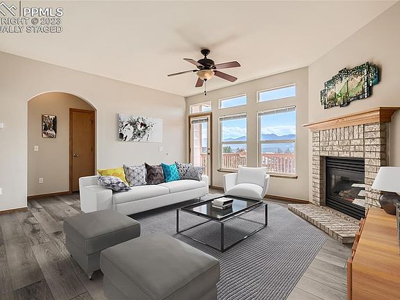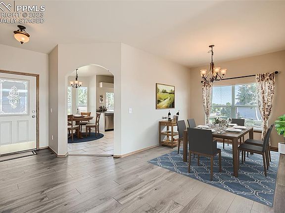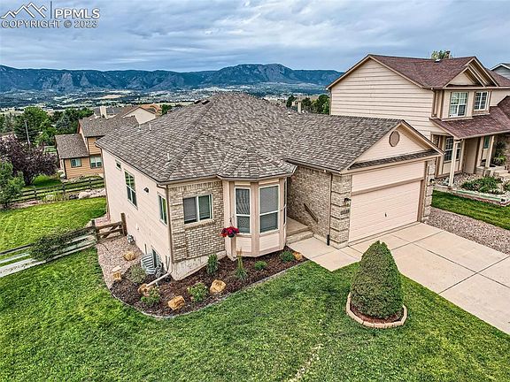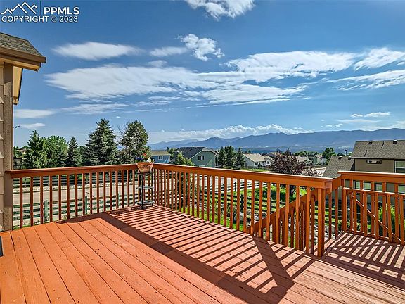 Views, Views, Views! This highly sought after ranch property rests in the Jackson Creek Community. The property welcomes you with Pikes Peak and grand Front Range mountain views on both the main floor and the basement levels. The main floor views begin in the entry foyer, owners main level bedroom, living room, dining room, second bedroom and deck. These magnificent mountain views are also enjoyed in the basement bedrooms, walk out basement and the lower outdoor living spaces. The entire basement had new upgraded padding and carpet installed in September 2023, this month! The spacious kitchen was just updated and includes stainless steel appliances purchase in 2019. The property has been well kept with recently upgraded LVT luxury vinyl flooring throughout 98% of the main floor. The 50 gal hot water heater was replaced in 2019 and new exterior paint in 2015. The main floor laundry room includes the Samsung washer and dryer set. The outdoor living space features a fully fenced backyard, upper view deck, lower partially covered patio, landscaped rock formation mimicking a beautiful pond and freshly seeded lawn among the lush sod. The Jackson Creek subdivision features many pocket parks within walking distance from the property. Paved and gaveled running and walking trails are enjoyed throughout. You will also find an elementary school with student bus transportation opportunities. Just outside the subdivision you have shopping conveniences in walking distance to the local grocery store, strip mall shopping, restaurants, home depot,Walmart,Starbucks and more. Quick FWY access to I-25, the Air Force Academy, Fort Carson, Space Command and only 42 miles from the Denver Tech Center. This property will move fast! Additional Articulation: The zoning is PRD-6 not PRD. Some of these images will include virtually staged furniture.