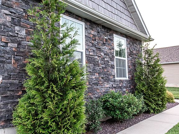 This beautiful home's stone exterior is framed perfectly with professional landscaping and automated irrigation system. Enter through the open foyer or mudroom to just over 1700 sq. ft. of open living spaces with hardwood floors and custom plantation shutters throughout. A gas stone fireplace anchors the 20'x12' living room with 19' vaulted ceilings. Flow easily into the kitchen and dining nook nearby. Sleek stainless steel appliances and fixtures, along with shiplap backsplash, soft-close drawers/cabinets outfit this modern kitchen and bar with seating for four. A master suite with his and her walk-in closets and over sized bath/tub combo provide plenty of privacy as the lone bedroom on the south side of the home. Guests enjoy two bedrooms and double-vanity guest bath on the north side of the home. Vinyl fencing surrounding the backyard with a 60-inch gate for riding lawnmower to easily pass. Unfinished basement with egress windows for the potential of two future bedrooms and rough-in for one bath. Washer and dryer hookups on both main and basement level. Side-entry garage with extended concrete pad for additional parking. Energy savings with LED light fixtures throughout the home. Call us to take a look at 573-366-0396.