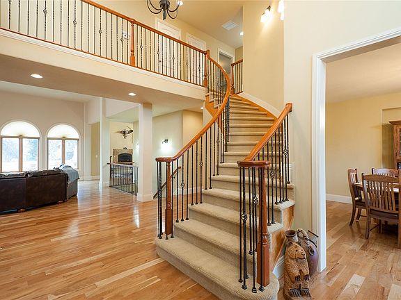 This home is located on a 1 acre lot in a 9-home community. There are 4 fireplaces and 3 laundry rooms. The kitchen has slab granite, island/breakfast bar,stainless appliances and a breakfast nook. There is a butler's pantry with cabinets, sink and wine refrigerator. The dining room is large enough to host your dinner party. The great room has a soaring vault, wall of windows for natural light and a gas log fireplace. In the study you will find built in shelving and glass French doors. Upstairs you will find the Master suite with stepped ceiling and large walk in closet. The master bath has an over sized tub, double sinks and travertine. In the basement there is a wet bar with cherry cabinetry, slab granite, ice maker. The yard is professionally landscaped and fenced, with a partially covered stamped concrete patio, built-in gas barbecue, outdoor fireplace and a water feature. There is a 45'x35' detached garage large enough to store your RV.