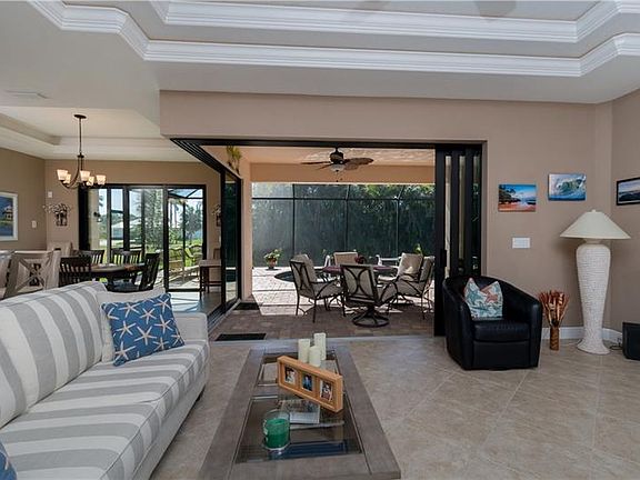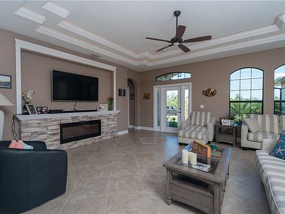WELCOME TO PARADISE! Built in 2016, this custom built Harden Dukes 3BD/2BA/2CG home boasts impact resistant windows, in wall pest control, re-circulation instant hot water, Isonyne Insulation alarm system, paver driveway/sidewalk & sprinkler system-well. Once you enter, you can appreciate the open floor plan (great for entertaining), double tray ceiling w/double crown moulding, diagonal tiled flooring, stone wall w/built in electric fireplace & sliding glass door to Lanai. Gourmet kitchen will inspire your inner chef w/its 42" cabinetry w/crown moulding on top, granite countertops, granite composite sink, tiled backsplash & breakfast bar. Appliances include: French door refrigerator, smooth top stove, built in microwave & dishwasher(all LG). Dining area has tray ceiling, crown moulding & sliding glass doors to Lanai. Master bedroom has plank tiled flooring, tray ceiling, crown moulding, walk in closet & sliding glass doors to Lanai. Master bath has double vanities w/granite countertops, linen closet, double entry Roman shower & extra cabinetry. Both Guest bedrooms have wall closets, tiled flooring, ceiling fans; one has French doors to Lanai. Inside utility room has utility tub & tiled flooring. Lanai is a great place to relax or soak up the sunshine in the caged Pebbletec electric heated saltwater pool w/outside shower. 2 car garage has epoxy flooring, extra built in shelving, automatic garage door opener & hurricane overhead garage door. Nothing to do but move in!