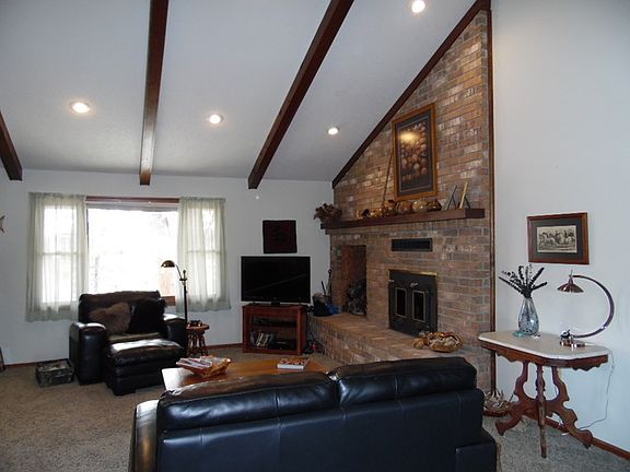 This is more than a place to live........this property is your own resort! Situated high upon a rock bluff with stunning views is this grand ranch style home. Small acreage with pond, mostly shady yard, but does offer some open ground for that "fair project". Vaulted and beamed ceilings in the great room, 2 wood burning fireplaces, newer roof, and upgraded heat and air system, attic fan, spacious rooms, with lots of walk in closets, massive family room in the walkout basement, lots of additional storage, cool deck sitting on "bluff top" views. Just minutes from Nevada and very secluded in the R5 district!