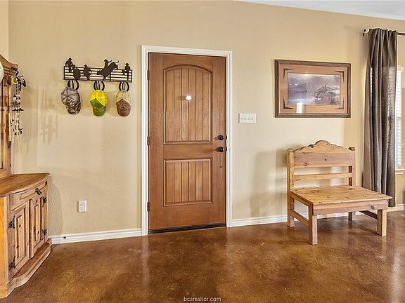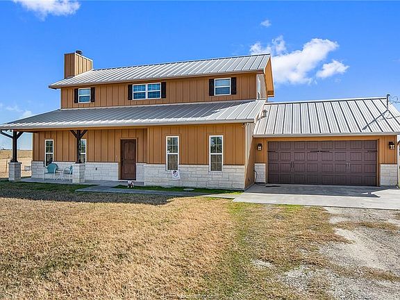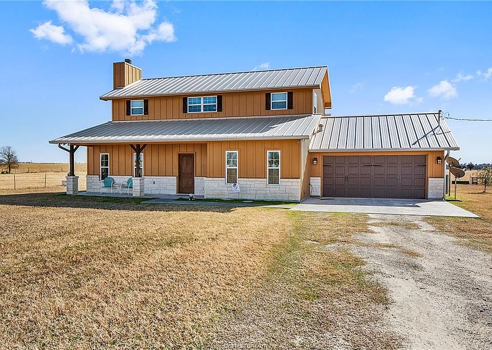 Almost brand new lovely farmhouse complete with metal roof on 10 wonderful acres! Custom built home with 3 spacious bedrooms, 2.5 bathrooms and an extra living space upstairs. The entire 10 acres has been fully fenced with a large gate at the front of the property. Located just 20 minutes from town and zoned to Bryan schools, this home is still close to anything you may need! The home offers the perfect place to entertain your friends and family or to enjoy the peaceful country setting. Step inside to find a stunning white stone fireplace, a bright and airy space with an open floor plan. The kitchen opens up to the great room and features granite countertops, an island big enough for 6 bar stools, plenty of cabinet space, stainless steel appliances and even a built in wonderful spot for your wine bottles! The downstairs master bedroom oasis is secluded and quiet with its own full bathroom featuring granite countertops, two sinks, a large soaker tub, a separate shower and a huge walk in closet with enough space to store more pairs of shoes than you can imagine! Just think, you could be drinking your coffee on the back patio looking over your little piece of heaven! Come soon or it will be gone!