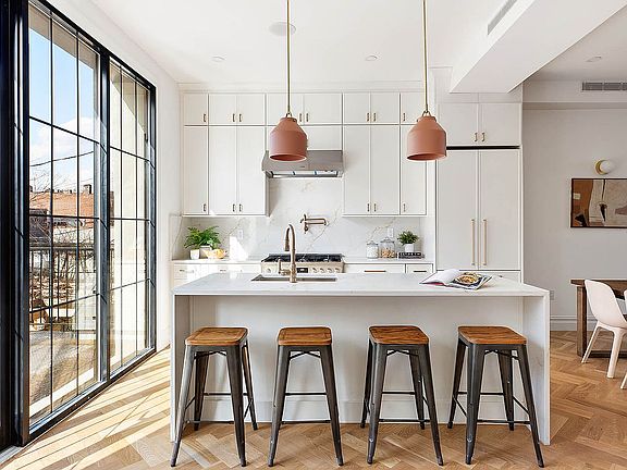 156 22nd Street was originally constructed in 1899. This newly renovated home is the perfect combination of high-end finishes, modern technology, and impeccable details, an honorable salute to its past. This two-family townhouse features 5 bedrooms, 3 full bathrooms, 2 powder rooms, a large parlor deck, an expansive backyard garden, and a recreational room. From wide-plank white oak floors to original doors and exposed brick, attention to detail can be found throughout this well-appointed home. As you enter the owner’s three-bedroom duplex, you are greeted by a welcoming foyer. Stepping into the parlor, you realize the breadth of space as the high ceilings let the light radiate throughout the open floor plan. To the right, a formal living room area offers an expansive area for entertaining. To the left is a thoughtfully designed powder room and space for a large dining table. In the back are your breakfast nook and an open kitchen with a four-seat island, custom cabinetry, and quartz countertops. With a farmhouse sink and a full complement of Bosch appliances including an integrated 36" French door refrigerator and a six-burner stove, this kitchen is a chef’s dream. Upstairs you will find three bedrooms and two full baths. The elegant primary bedroom faces the serene backyard and features two windows and a large walk-in closet. The windowed primary bathroom has marble-tiled floors, a tasteful double vanity, and a standing shower. In the hall, you pass the second bathroom, the washer/dryer closet, and two comfortable bedrooms. The private basement can be accessed through an interior staircase and is finished with textured tile floors and a powder room. It can easily be transformed into a playroom, home office, or artist studio. The separate garden floor two-bedroom, one-bathroom unit serves as an income-producing property or in-laws' suite. This masterfully re-imagined townhouse is located in the heart of Greenwood. You are moments away from great dining and coffee establishments such as Guiseppina's, Greenwood Park, Tin Cup Cafe, Baked in Brooklyn, Siren Oyster Bar, and Sea Witch, to name a few. Nearby public transportation includes the R train at Prospect Avenue or 25th Street.