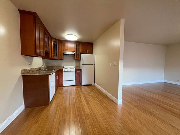 This spacious unit offers a warm and inviting atmosphere with hardwood flooring throughout the living areas and a sleek, tiled bathroom. Large windows fill the space with abundant natural light and provide excellent ventilation, creating a bright and airy environment. The kitchen is equipped with rich dark-wood cabinetry and crisp white appliancesincluding a dishwashermaking meal prep and cleanup both stylish and convenient. Perfect for comfortable living in a well-appointed home.
