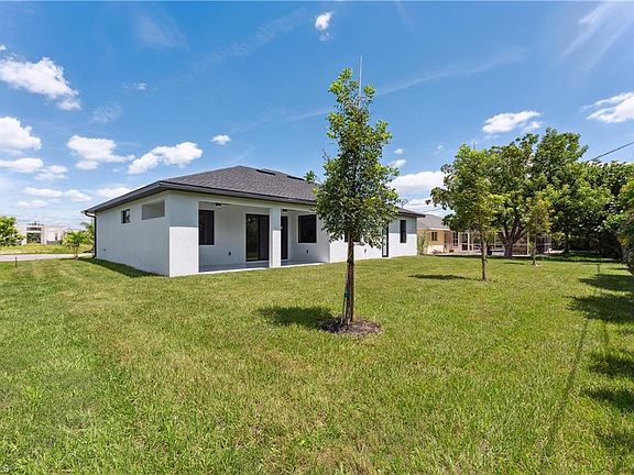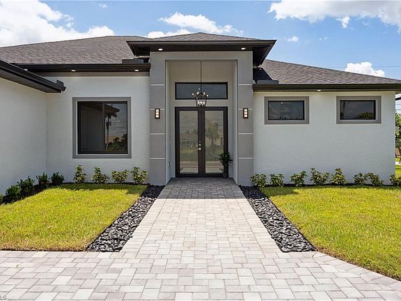 Gorgeous NEW construction in Cape Coral! No detail has been missed in this open concept layout with porcelain tile throughout, quartz countertops in the kitchen and baths. Kitchen features soaring 12' ceiling, large center island, NEW stainless steel Whirlpool appliances, backsplash and stainless pull-down faucet. Grand family room with a 13' tray ceiling, 72" signature oscillating fan and sliding doors that walk out to the open lanai. 9' ceilings throughout the rest of the property, 8' interior doors and impact resistant windows and doors. Spacious master bedroom with tray ceiling, a pair of walk-in closets and luxurious master bath with his and her sinks and stunning walk-in shower. 3 additional bedrooms all with easy bathroom access. Relaxing south facing lanai offers generous room for patio set and/or outdoor table. This space has 2 ceiling fans and has been pre-plumbed for an outdoor kitchen. Plenty of room to add a pool on the .23 acres lot. Full pool/guest bath already! Private backyard is partially fenced with mature landscaping. 2 car garage with epoxy floors. Circular paver driveway. Walk to popular conveniences and shopping! NO HOA!! ALL ASSESSMENTS PAID!! MOVE IN READY!