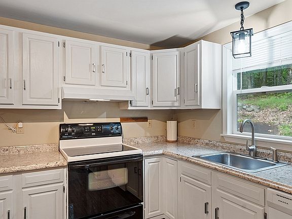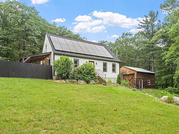Nestled on 2 acres on a private hillside location is this very charming 2 BR/1 bath, open concept cape-style home with accompanying barn/garage! The bright and cheery kitchen features new tile flooring, overhead lighting, pantry area, and kitchen island with custom butcher block countertop open to the formal dining room. The front to back living room exits to outdoor space with covered patio area and firepit for your summer enjoyment. Upstairs you will find two large bedrooms, each with wide pine flooring and lighted ceiling fans. A large hallway area, with a storage closet, could host a future bathroom. New roof in 2022. Wild blueberries and raspberries flourish in the wooded back yard area. Welcome Home!
