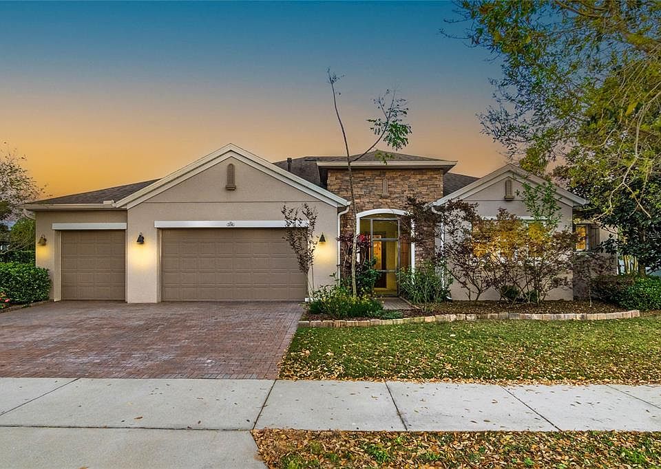 Welcome home to the highly sought-after, resort style 55+ community of Trilogy in Groveland. Relax and enjoy your maintenance free lifestyle in this desirable, Hickory Model, Shea full solar home featuring Wood-look Ceramic Tile and 5 inch baseboards throughout and too many upgrades to mention. This home boasts an open floor plan with plenty of natural light overlooking a gorgeous screened in lanai with views of the lake and your very own Zen Garden with water feature and butterfly garden. Your Grand Gourmet Kitchen features granite countertops, 42-inch custom solid wood cabinets with crown molding and soft-close feature, under-cabinet lighting, gourmet stainless steel appliances, eat-in bar, and adjacent dining room. The smart space room is just off the kitchen and features a washer, dryer, desk and walk-in pantry, while additional built-in cabinets and granite counters provide for an office space or hobby room. The Owner's Suite is highlighted by an elegant entry that leads to the spacious master bedroom with plenty of natural light and peaceful views of the lake, semi-private lanai and Zen Garden. The grand en-suite features His & Hers vanities with granite countertops, custom solid wood cabinetry, walk-in shower, separate water closet, and large walk-in closet. The beautiful guest bedroom with private en-suite features a full-size closet, plenty of natural light and is large enough to accommodate a king size bed. This beautiful home features a bonus room with built in desk and access to your side lanai and may be utilized as an office, den, media or game room and can easily accommodate a sleeper sofa. The home is energy efficient with full solar, double pane Low-E windows and extra insulation in the attic and is centrally located between Disney, Coco Beach and Tampa. The HOA fee includes cable TV, internet, home phone, security monitoring, lawn and shrub maintenance, guard gated front entrance and clubhouse amenities. You are sure to find plenty to do as you drive up to the 57,000-square-foot clubhouse, Magnolia House, with a full-service restaurant and bar, fitness center, hot tubs, luxurious indoor/outdoor community pool, tennis, pickleball, bocce, demonstration kitchen, art studio, walking trail and numerous other amenities. For those interested in this 55+ community, please be aware the community has not reached the max 20% of residents under 55 permitted. The community allows residents between the ages of 45 to 54.