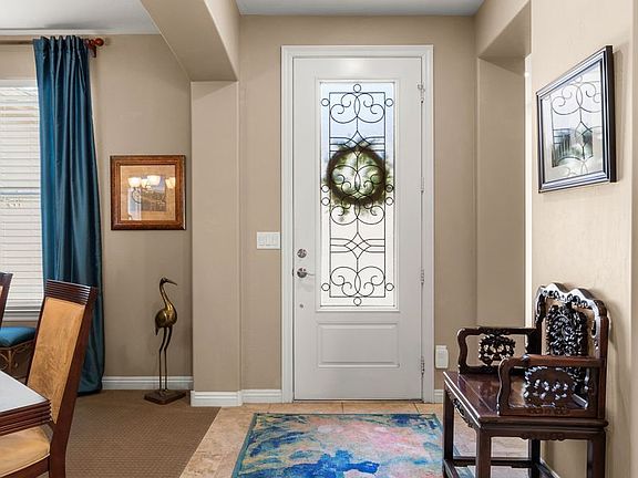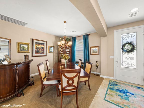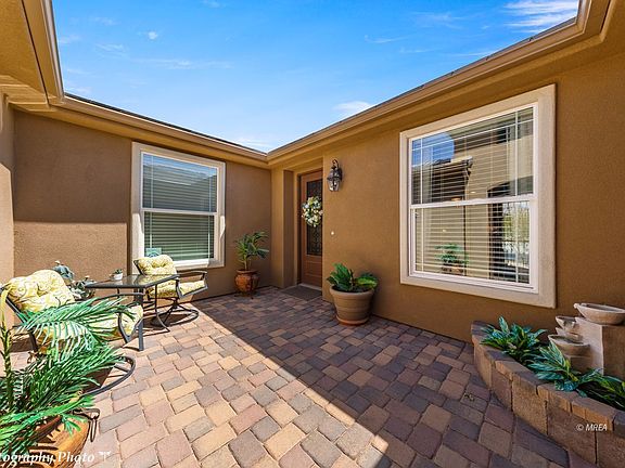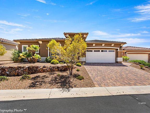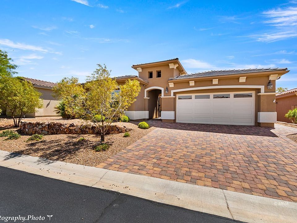 This gorgeous home shows like a model! Situated on a premium elevated home site, this spacious home offers stunning views of the Virgin Mountains. An extended paver patio provides the perfect outdoor space for entertaining and the landscaping is thoughtfully designed and full of color. A large front courtyard provides privacy and is a beautiful entry to the home. The open floor plan is appreciated with 2,192SF and a much needed oversized garage. Anchoring the kitchen is a granite covered island. Custom back splash, stainless appliances and upgrade cabinetry decorate the space. The great room is lined with windows allowing the outdoor mountains to be seen from every corner. A custom fireplace & warm paint tones add to the space. The owner's suite is spacious and the ensuite hosts duel vanities, large soaking tub & sizable closet. A separate den/office makes for the perfect work space. Two guest bedrooms & full bathroom are located at the opposite side of the home ensuring privacy and a half bath is much appreciated. The seller is so conscientious that she installed hydraulic toilet seats on all commodes. A full house water conditioner is a bonus & the laundry room, full of storage.