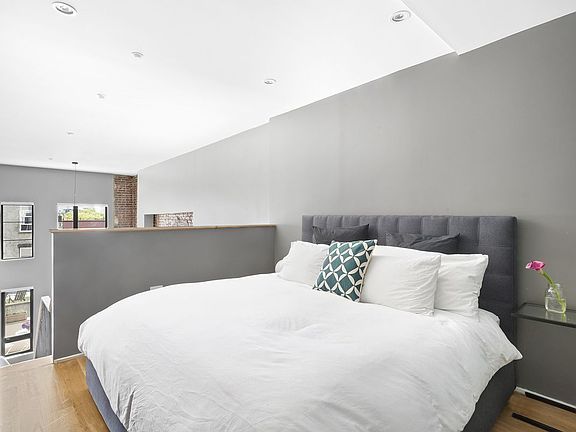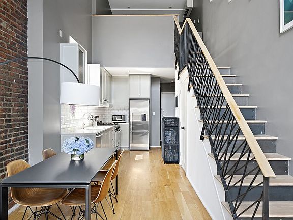 This beautiful, sun filled prime Williamsburg condominium offers loft living with incredible 18-foot ceilings, a full wall of original exposed brick, two bathrooms, open kitchen with high-end finishes and a private balcony. The loft features reclaimed pine wood doors, a custom staircase built from hand-wrought metal, and whitewashed oak floors. 3C is truly a unique, architecturally designed residence that exemplifies high-end craftsmanship and luxury living. The open living room boasts soaring ceilings and incredible double height windows delivering a sun- drenched living space. The windows come equipped with electronic blinds for your convenience. Connected to the living room, the exquisite open kitchen is finished with gray inset shaker-style, vintage wire and glass cabinets, complimented by an ivory subway tile backsplash and Electrolux, Bertazzoni, Fisher & Paykel stainless steel appliances. This loft is delivered with a Bosch washer and dryer in unit. The first floor bathroom is adorned with Caesarstone countertops, white subway tiles, a custom pine vanity, and a soaking tub. Attached to the lofted bedroom you'll find a Euro-style wet room which offers the second full bathroom featuring floor-to-ceiling frosted glass. 156 Broadway is a boutique 8-unit condominium located in heart of South Williamsburg that features an elevator and video intercom system. The building was originally constructed in 1920, the facade features classic brickwork and unique masonry. 156 Broadway was converted to condominiums in 2014 and underwent a complete renovation. You'll find dozens of charming boutiques and some of the best restaurants in New York City nearby. The J, M, & Z subway lines and East River Ferry are just minutes away providing easy access to Downtown or Midtown Manhattan. The L train is also in close proximity.