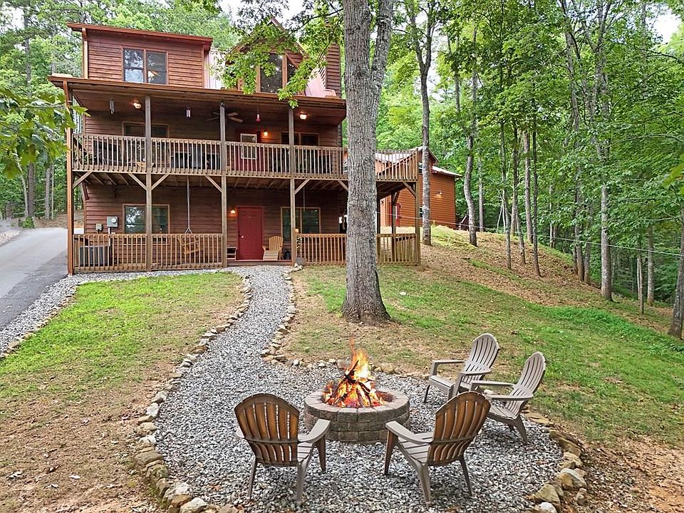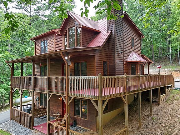 Star Gazing, no City lights, Bring a telescope to this amazingly well Loved and maintained Mountain Chalet. This property includes a 3BR/3BA all wood interior cabin PLUS an amazing detached 30x24 2 car garage w/ bonus room above. Plenty of parking for boats and toys. Finish the room for overflow guests. The home features 1BR/1BA per floor and would make an amazing rental. The great room features a cathedral ceiling, rock face fplc w/ gas logs, Exposed beams and a LARGE dormer window allowing in loads of natural light. Bayed dining area. Hardwood floors on the main floor,pine upstairs. Large loft overlooking the Great Room . Jetted tub and shower in the primary bathroom. Lower level finished with a den, Bonus room, br/ba and exterior patio leading to the fire pit. Metal Roof. Fenced garden area. This paradise is Tucked away in the woods and equally accessible to Blairsville, Blue Ridge, and Murphy NC. Close to Lake Nottely Dam, hiking, fishing, boating. Paradise awaits.