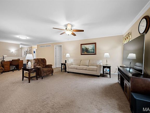 Impeccably maintained villa in the sought-after St. Andrews neighborhood! This charming home is immaculate, smoke free, has been lightly lived in and sits on a quiet cul de sac street. The exterior is impressive with a brick facade, stone accents, carriage style garage doors, address stone, architectural shingles, professional landscape and a lawn irrigation system. Features include 3 bedrooms, 3 bathrooms, 2,152 sq ft of finished living space (including the finished lower level), an oversized garage (22.5D), Great Room, Dining/Flex area, crown molding, stainless steel appliances, gas stove (prepped for gas and electric), dishwasher, microwave, raised breakfast bar, 42 inch cabinets, recessed lighting, breakfast room, main floor laundry, sliding glass door with built in blinds, coffered ceiling in the Primary Bedroom, walk in closet, transom window in the Primary and secondary Bath, shower, vanity with knee space, large window in the secondary bedroom, ceiling fans, Family/Recreation Room in the lower level, bar/beverage station, bedroom with egress and a full bath. There is a 10x12 covered, composite deck with steps to the yard for outdoor enjoyment. A low monthly fee takes care of snow removal, lawn care, some exterior maintenance and more (per C&Rs). There is easy access to Highways 70, 370 and 364, Lambert International airport, restaurants and shopping. Enjoy miles of neighborhood walking trails, fantastic location, so much to love!