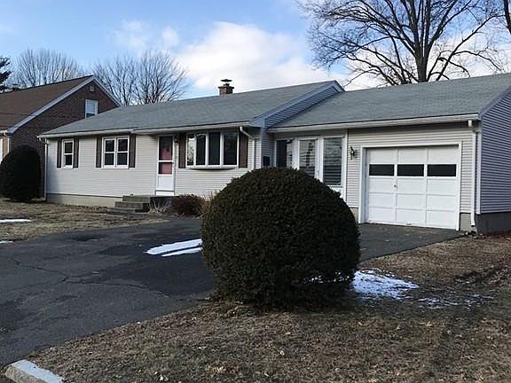 Classic Ranch with beautiful hardwood flooring throughout (Except the kitchen, bath and breezeway). The breezeway is huge and has roll out glass shutter windows facing the front and back yards. It is not heated, has been stripped of previous flooring. It is located between the kitchen area and garage. The one car garage has an automatic garage door opener and is attached to the main entry (breezeway)The basement features a walk in cedar closet and a washer/dryer hookup. The basement is unfinished but the ceilings are high and the floor plan is wide. This house is ready for updates and your personal style. The backyard is level with 3 trees far from the house. Perfect starter home to fix up while you live there. Windows and siding were upgraded in 2002. Furnace was just fixed and upgraded in 2016. Walk to a popular seasonal ice cream shop on the corner of Chapel and Granby Rd this spring!
