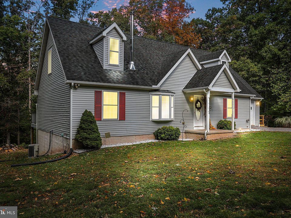 This is a great opportunity to get this large, Excel Modular Cape Cod, in Hedgesville WV on a partially wooded 2-acre lot for a sales price of $299,900.00. ALL THE WALLS, TRIM AND INTERIOR DOORS ON THE ENTIRE FIRST FLOOR HAVE BEEN NEWLY PAINTED. The main level features are: living room with a picture window and a beautiful blue soap stone woodstove w/ large glass front for viewing those cozy fires, ample firewood is cut to length and split for several years of heating, the kitchen has a large lazy Susan corner cabinet and several pull-out shelves, from there you'll access the 10x62 composite deck with interlocking floor, nice for grilling or entertaining, separate dining room, a primary bedroom with a full bathroom, two additional bedrooms, and laundry area. Check out the huge, open, finished upper level, the area over the garage is finished too and could be used as an office/den with multiple bookcases, the eaves of the Cape Cod provide a large amount of easy access storage. The upstairs has waterlines roughed in for multiple possibilities, including additional bedrooms and a bathroom. Separate zoned heating for the first and second floors. Full unfinished, open, walk-out basement with poured foundation walls, French doors lead you to the 10x62 fiber reinforced concrete pad, be sure to sit out there and enjoy all the wildlife. The attached, single car garage offers a built-in shelving unit, work bench, large pegboard to organize your tools, an additional main door and exterior landing making a great entry way for daily use. The T-shaped driveway is convenient for turning vehicles around and providing additional off-street parking. The house has a 4-bedroom septic. The lot has road frontage on both sides of the property. Location, Location, Location, only 25 minutes from I-81 and 15 minutes from I-70. This is a large house with lots of potential!