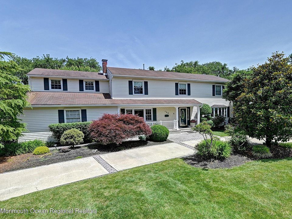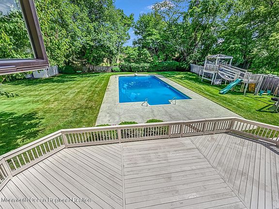 Drive up the circular driveway to this stately 5 bedroom 3 full bath front porch home situated on over half an acre o guyf land in Freehold Township with a gorgeous almost Olympic sized pool (very large shallow end and a 14' deep end) surround by patios and an oversized deck off the back of the home.Inside you will find french doors leading to the L shaped Living Room/Dining Room and then another door to your gourmet pickled wood kitchen having a Subzero refrigerator, Thermador double ovens (micro as is),corian counters and a amazing walk in pantry. The family room has a gas fireplace and doors to the deck. There is a full bath on this floor as well. The upper level has a huge master bedroom suite.. with walk in closet, 5 more closets, dressing area, steam shower, bidet and your laundry chute. All of the bedrooms are oversized while one of the other bedrooms has a loft and skylight. There is hardwood floors throughout the home even under the carpeting. The roof was replaced approx. 11 yrs and windows approx. 9 yrs. and for your comfort there is an AHS Buyer Protection Plan. Come see your next home!
