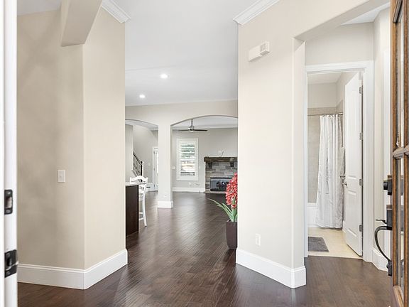 The main living area offers an open-concept design with 10-foot ceilings, 2 full baths, recessed lighting, and elegant finishes throughout. The chef’s kitchen boasts a gas cooktop, large pantry, granite, and an oversized island that’s perfect for entertaining guests. Adjacent to the kitchen, the formal dining room sits just off the grand arched foyer, providing a perfect space for gatherings.