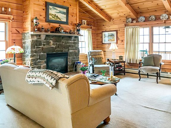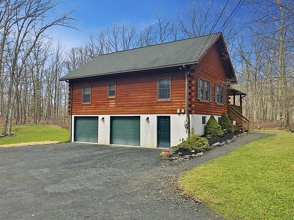 Custom built ranch style Log Home on 2.9 private acres located near the Delaware Water Gap National Recreational Area. This 3 bedroom 2 bath home features a large living room with stone fireplace and vaulted ceilings. Kitchen with attached laundry room and large pantry. Large sunroom that overlooks the surrounding forest and is attached to a large back deck. Downstairs there is a large finished basement that has both a family room and a craft/ multipurpose room. Attached to the family room is a large storage room with built in shelving. This home sits only 5 minutes from the historic Dingmans Ferry Bridge allowing quick access to NJ and NY.
