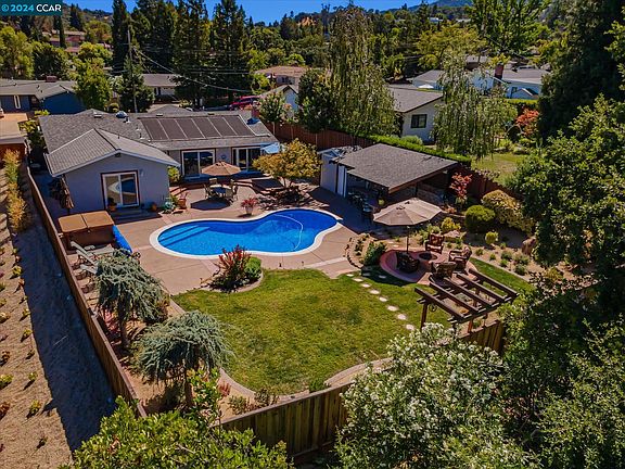 Beautiful single level in 'Virginia Hills' offers a one-of-a-kind backyard and Mt. Diablo views! Perfect for gatherings, this remodeled home boasts a spacious living area with travertine fireplace, surround sound, quality custom millwork, LVP flooring and dual sliders. The updated kitchen features cherrywood cabinetry, Silestone counters, custom built-ins, Dacor and Bosch stainless appliances, and a large breakfast island! A spacious primary suite offers yard access, a walk-in closet and bath with dual shower. Oversized secondary bedrooms have shutters, mirrored closets and fans. Designed for entertaining and relaxation, the rear yard is a private paradise with a solar heated saltwater pool, hot tub, lawn with floral gardens, multiple patios, stone gas firepit with vistas, and a poolside kitchen cabana! Enjoy a stunning covered concrete bar with abundant seating, a gas BBQ and cooktop, sink, refrigerator, ceiling fans, and tv mount plus speakers! This home has been lovingly maintained and updated by the same owner for 30 years. Other features include an alarm system, solar attic fans, LED lighting, removable pool fence, garage storage cabinets and a newer driveway. Located near Lafayette/Pleasant Hill borders close to parks, shopping, BART, and desirable Pleasant Hill schools!